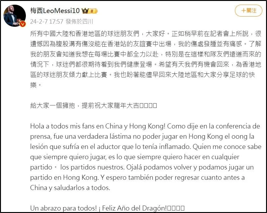 在引起轩然大波后,这名阿根廷超级球星也通过微博发表中文声明,对因伤缺席比赛表示遗憾,希望未来还有机会在香港比赛,但却未道歉或提出善后举措。