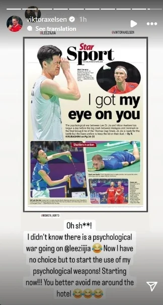原来,这是安赛龙在回应一名球迷上载《星报》报道的标注,安赛龙就在其IG限动转载,并标记李梓嘉写道:“我都不知道我和@leeziijia之间存在心理战😂,现在我已没选择,必须开始用心理战作武器!从现在开始!!!你(梓嘉)最好在酒店避开我😂😂😂”