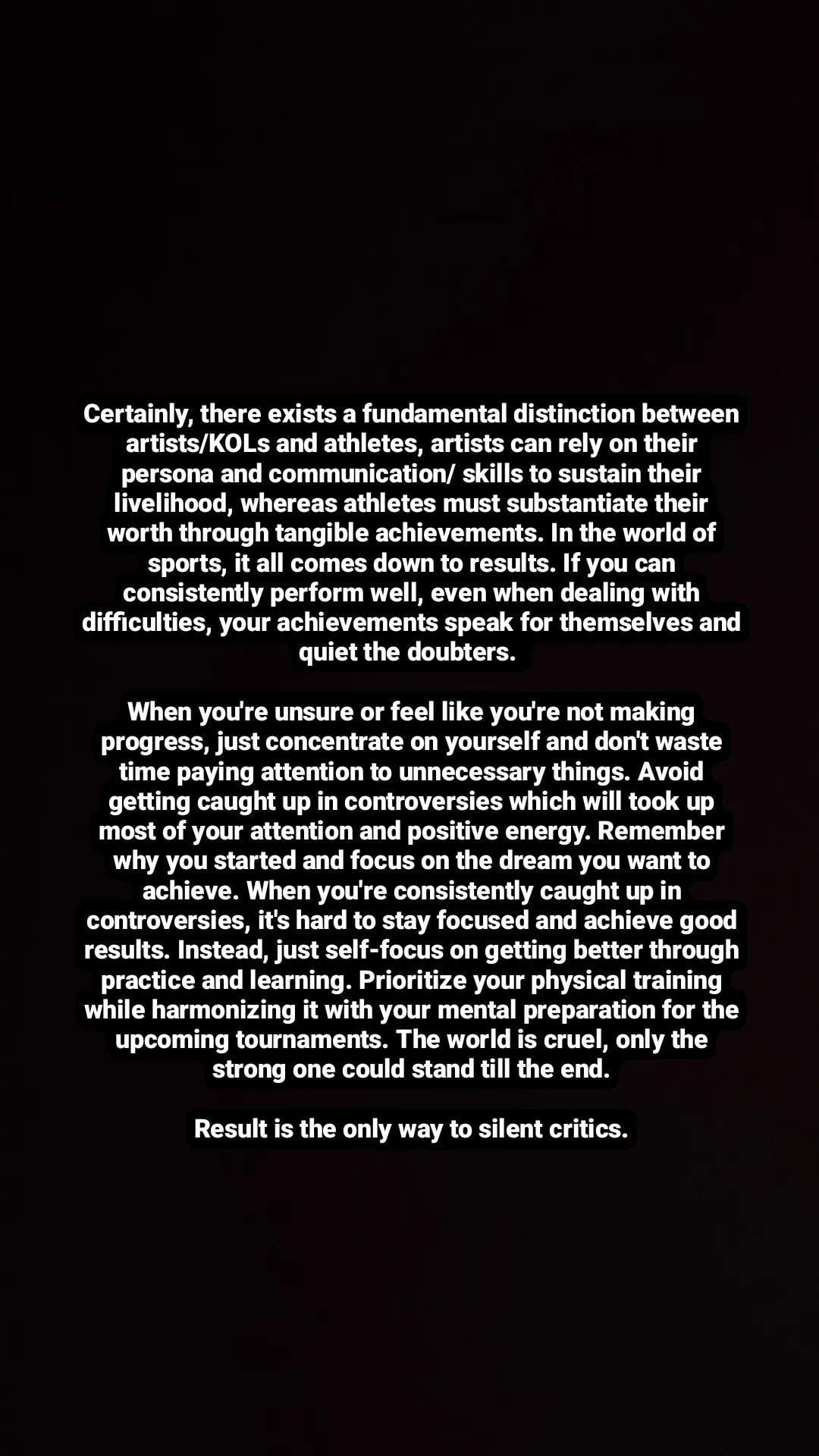 他说,当经常陷入争议中,将很难保持专注并取得好成绩,反之,应通过自专注,让自己通过训练和学习变得更好,并为即将到来的比赛做好心理准备。